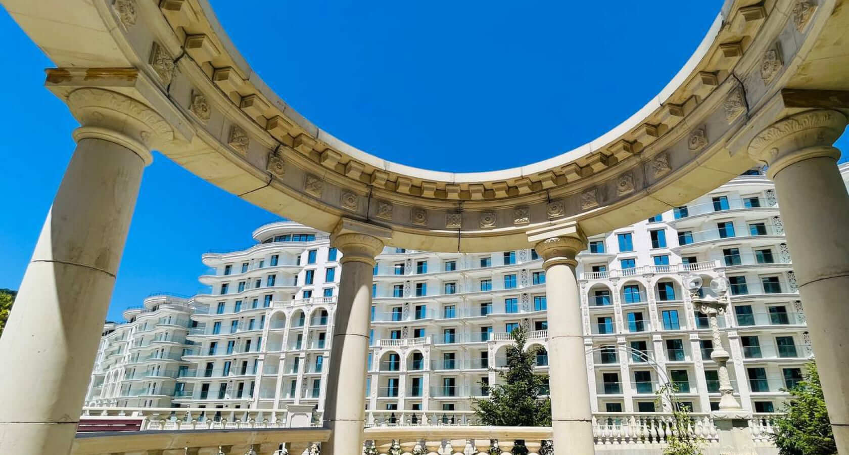 Архитектура комплекса сочетает в себе элегантность и функциональность: натуральный камень в фасадах, панорамные окна, которые визуально расширяют пространство, и белоснежные колонны, добавляющие изысканности. Ландшафтный дизайн с субтропическими растениями создает атмосферу уединения и комфорта.